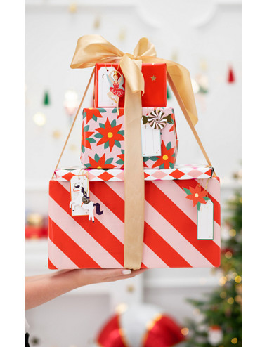 Zawieszki do prezentów Dziadek do orzechów wykonane z papieru, mix wzorów i kolorów. Zestaw zawiera 12 zawieszek (4 wzory, po 3 szt. z każdego wzoru) i 2.5 m złotego sznurka.