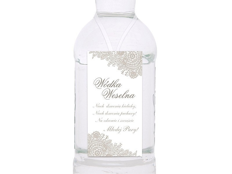 Papierowe zawieszki na wódkę weselną ze srebrnym/szarym nadrukiem i białą wstążeczką satynową.